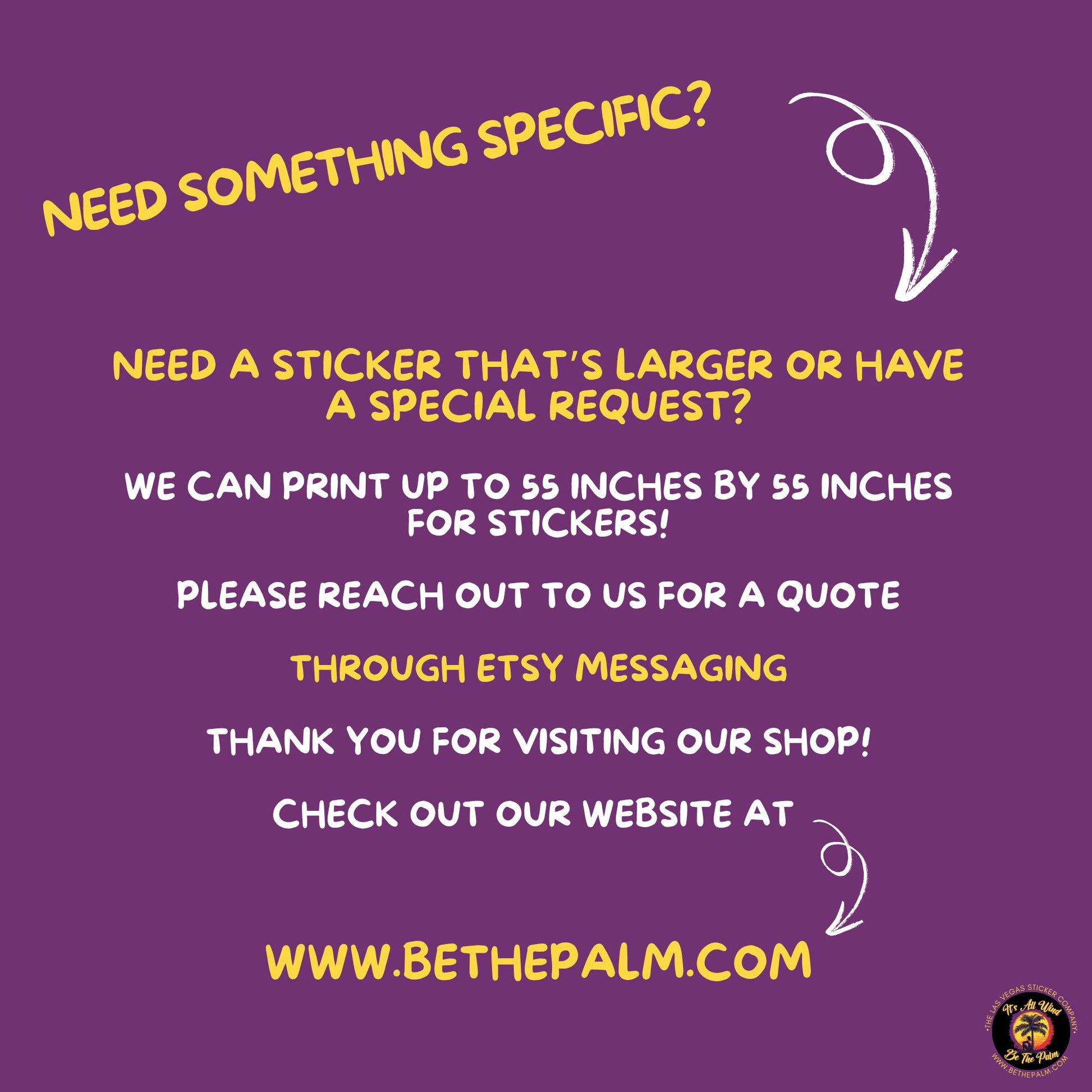Use of BE THE PALM LLC sticker products on custom, aftermarket, ceramic-coated, matte, vinyl-wrapped, repainted, or non-OEM surfaces is done entirely at your own risk.